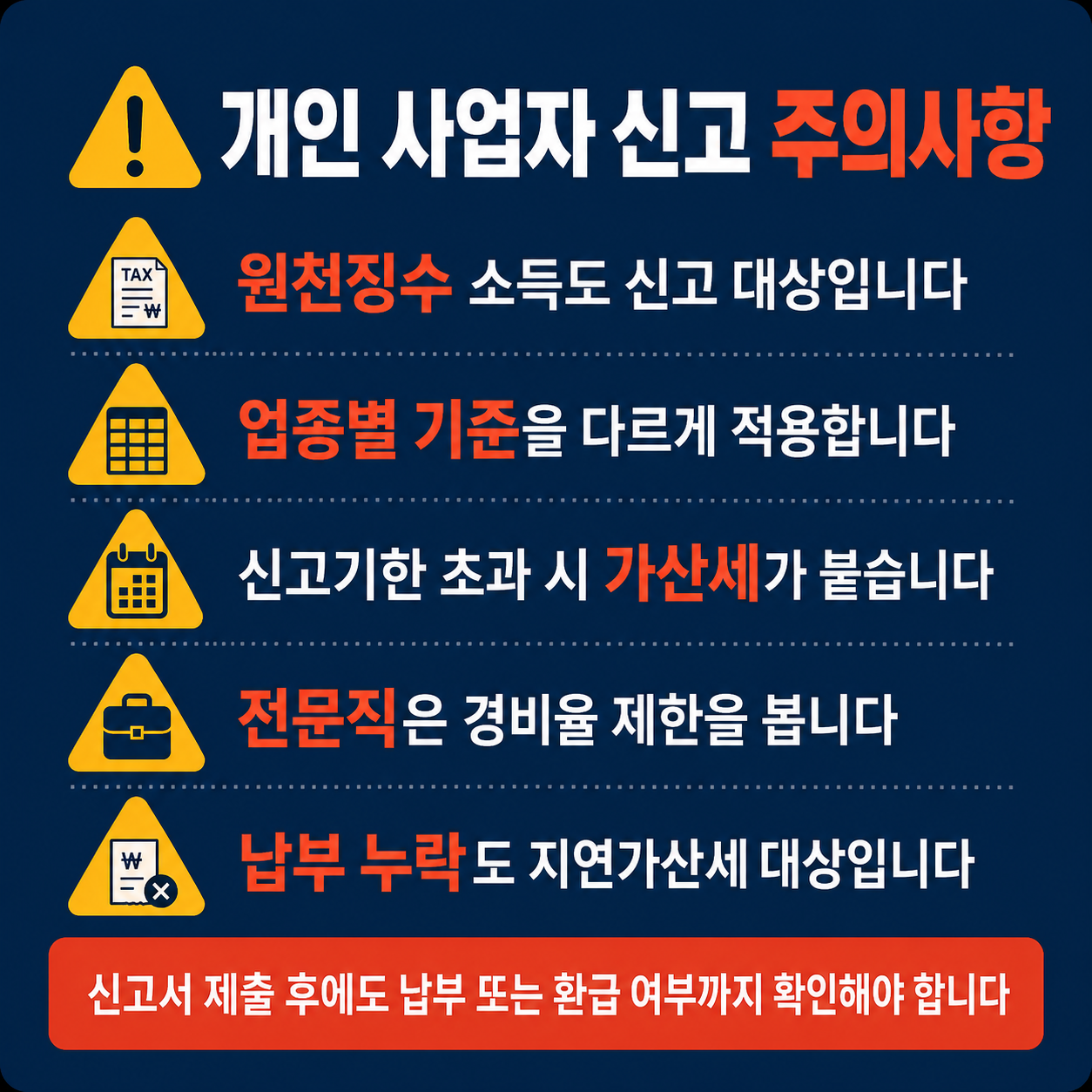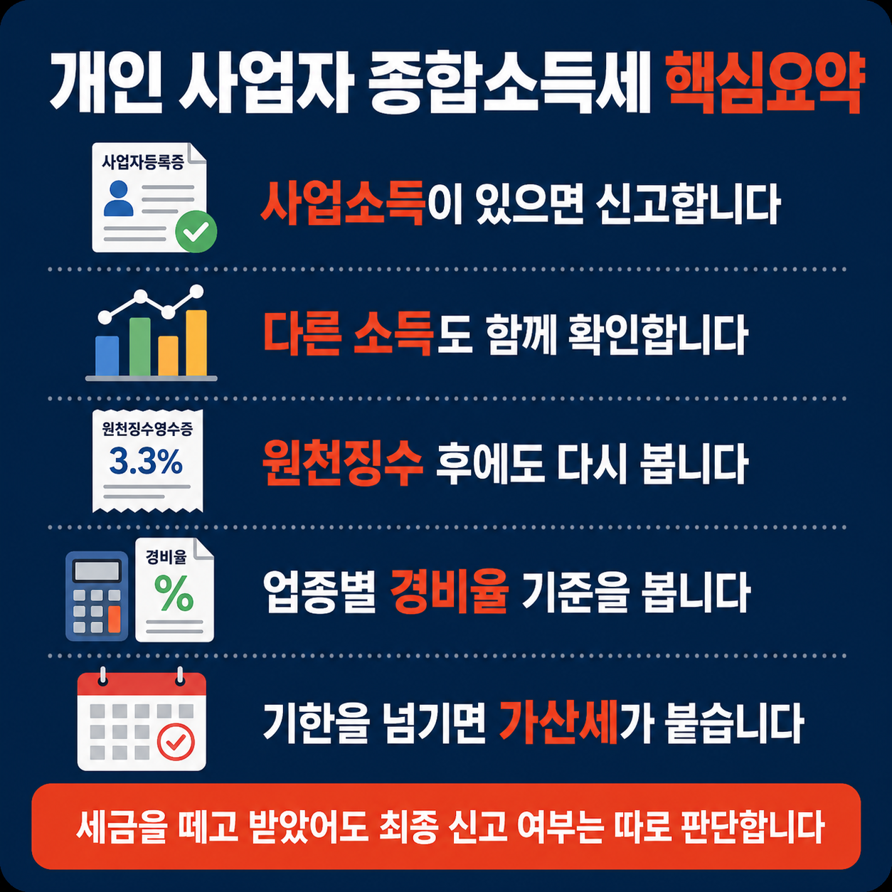 - ✔ 사업소득 외 근로소득, 연금소득, 기타소득이 있으면 합산 신고가 필요할 수 있습니다.