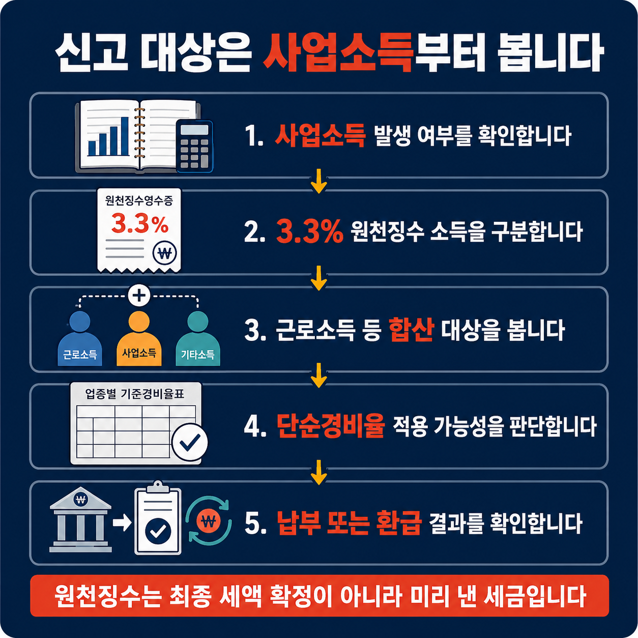 - 3.3% 원천징수된 소득도 종합소득세 신고 대상이 될 수 있습니다.