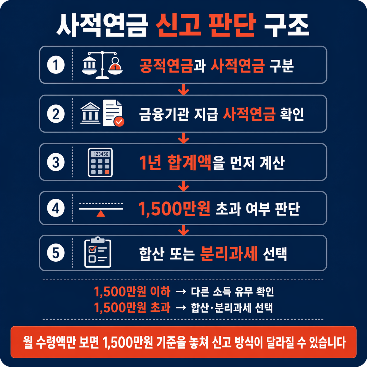 사적연금 판단의 핵심은 월 수령액이 아니라 연간 합계액 1,500만원 초과 여부입니다.