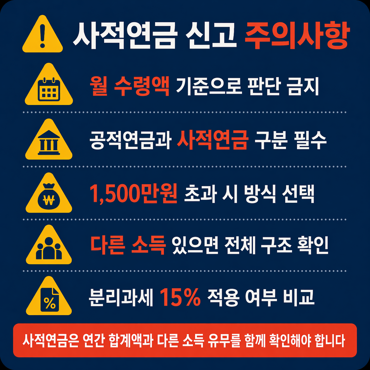 - 🧾 사적연금만 있는 경우: 연간 합계액 1,500만원 초과 여부를 확인합니다.