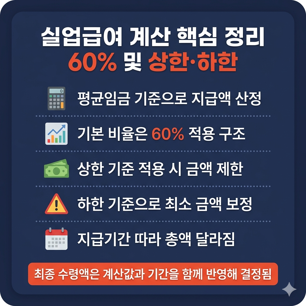 다만 실업급여 계산 방법에서는 상한 적용 여부가 중요해, 계산값이 높아도 실제 지급액은 상한 기준에 맞춰 조정될 수 있습니다.