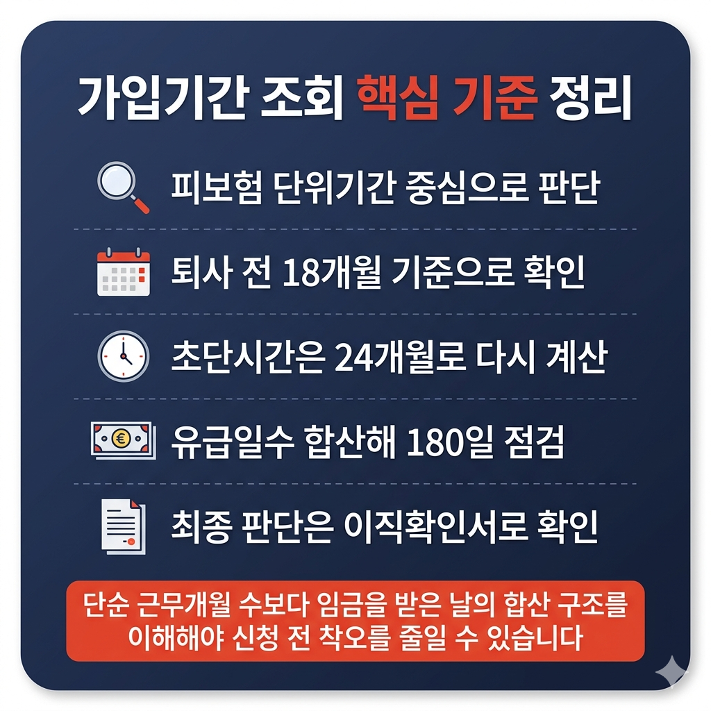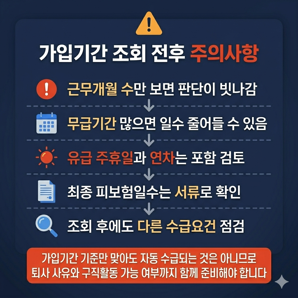 가입기간 조회가 끝나도 실제 수급 판단은 지급기간과 함께 봐야 정확합니다. 실업급여는 가입기간만 맞는다고 끝나는 것이 아니라, 다른 수급요건도 함께 충족해야 합니다.