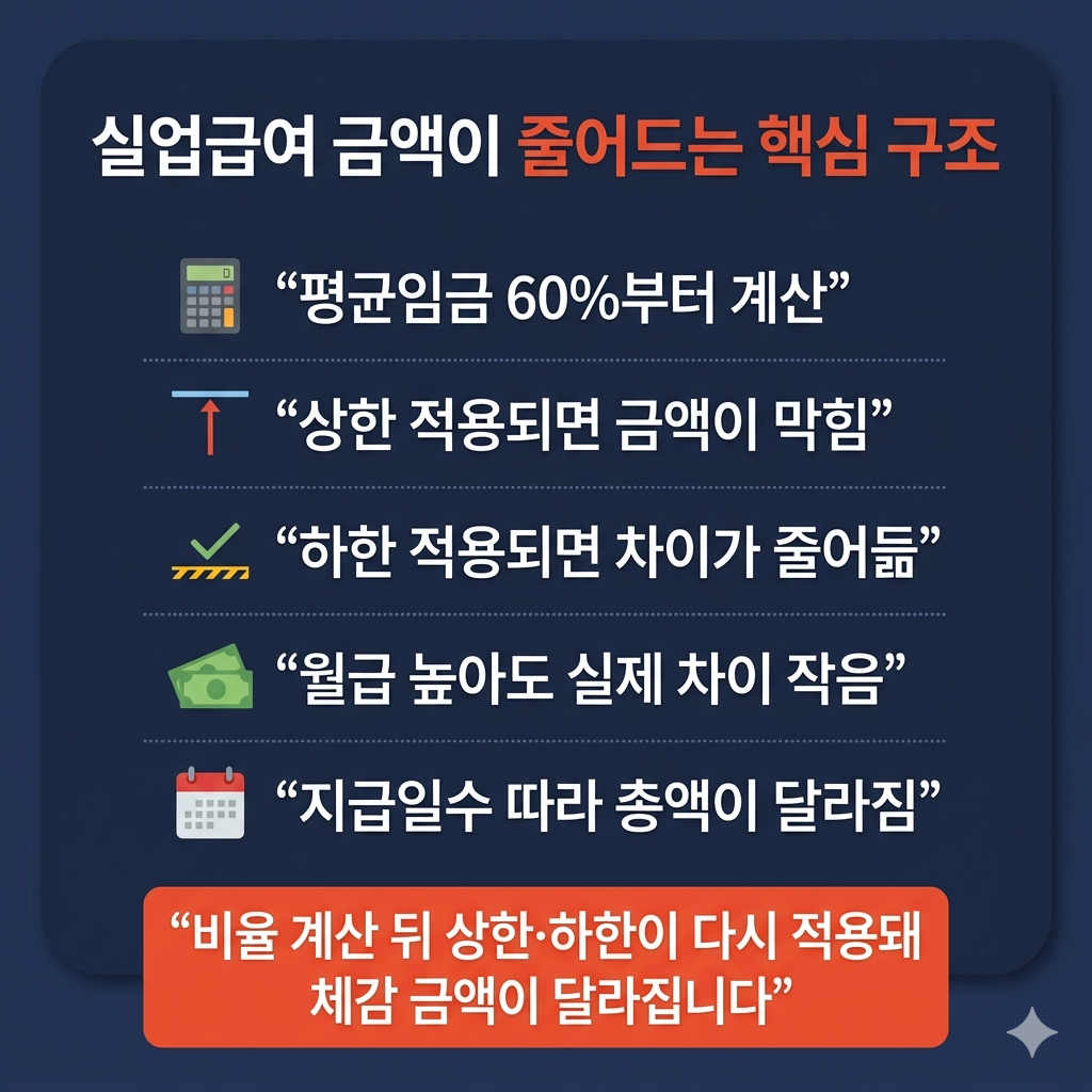 결국 실업급여 금액은 비율 + 상한·하한 제한 구조 때문에 차이가 발생합니다.