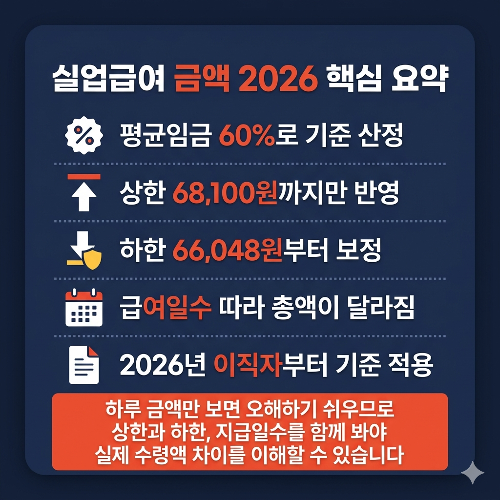 실업급여 금액 2026은 단순히 월급의 60%만 보는 것이 아니라, 상한액·하한액·지급일수를 함께 봐야 정확합니다.