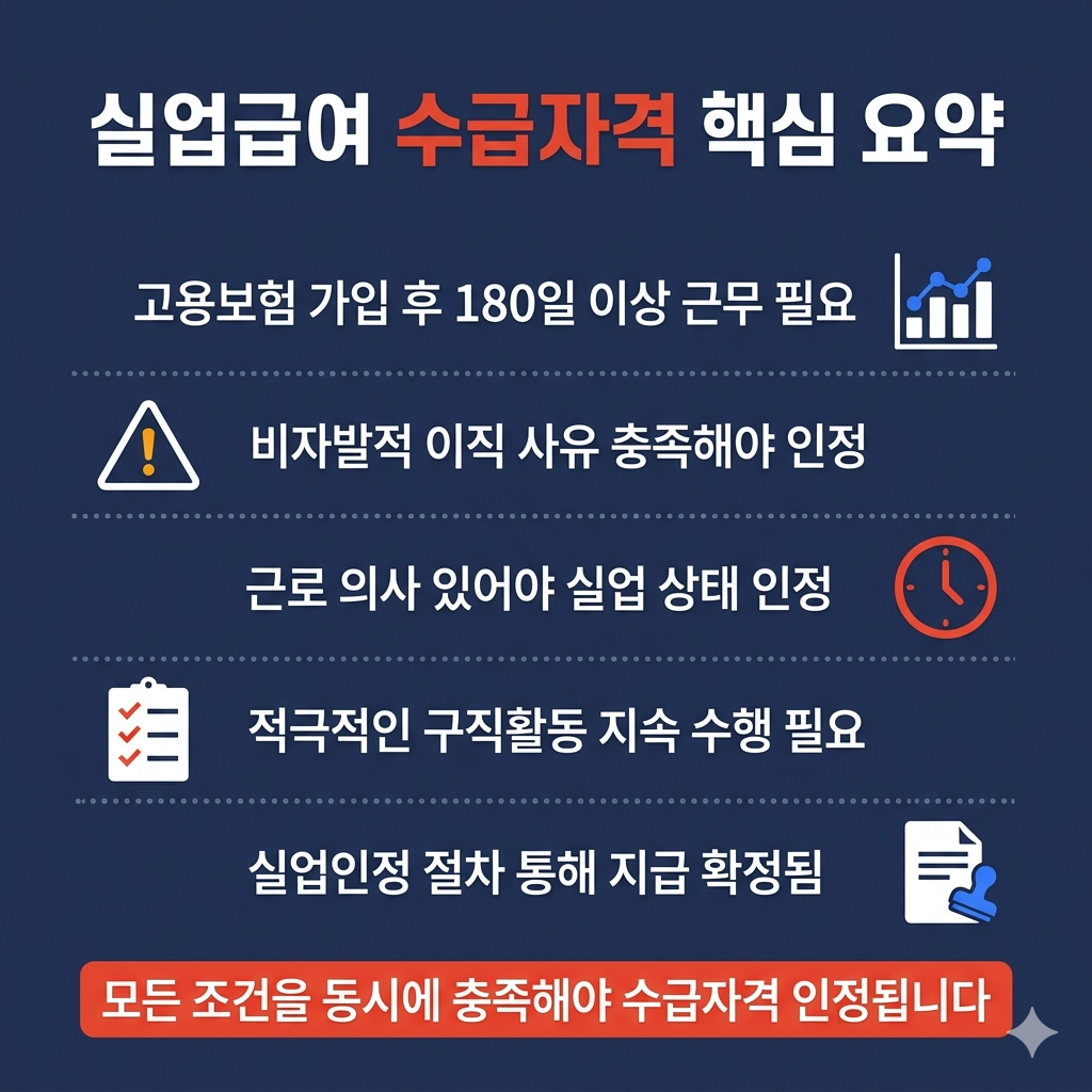 즉, 하나라도 조건이 빠지면 실업급여 수급자격이 인정되지 않습니다 📌
