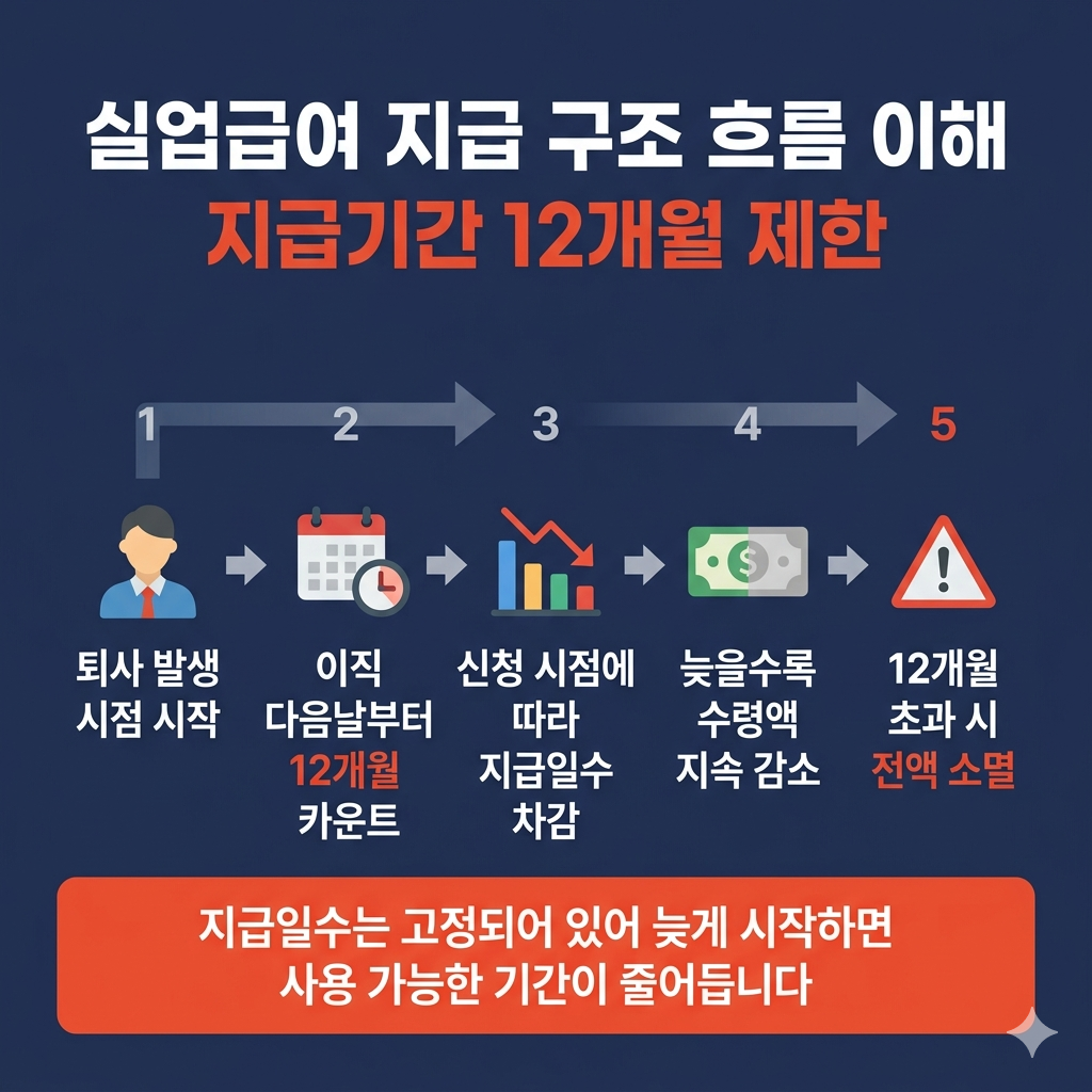 하지만 이 지급일수는 반드시 실업급여 신청 기한 12개월 내에서만 사용해야 합니다.