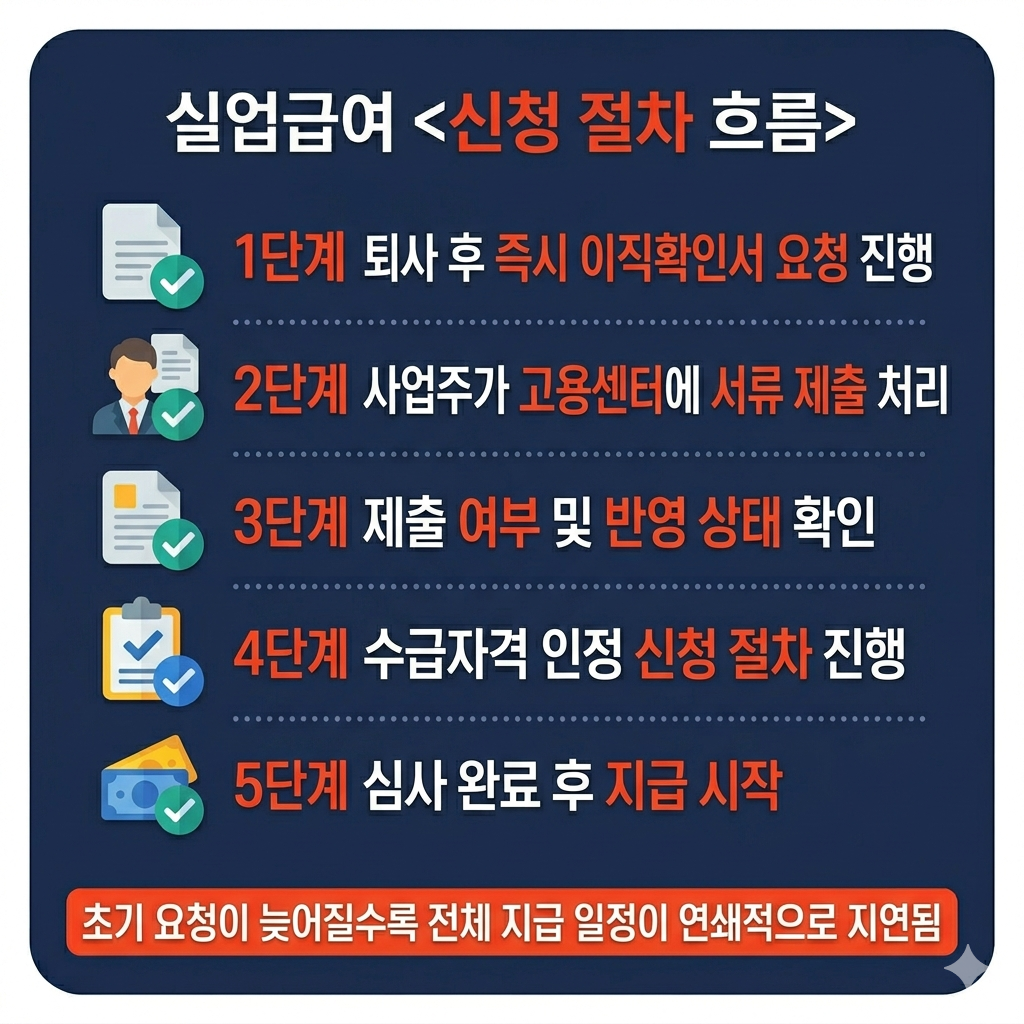 이직확인서 제출이 늦어지면 수급자격 심사 자체가 시작되지 않아 지급이 수주 이상 지연될 수 있습니다 ⏱️
