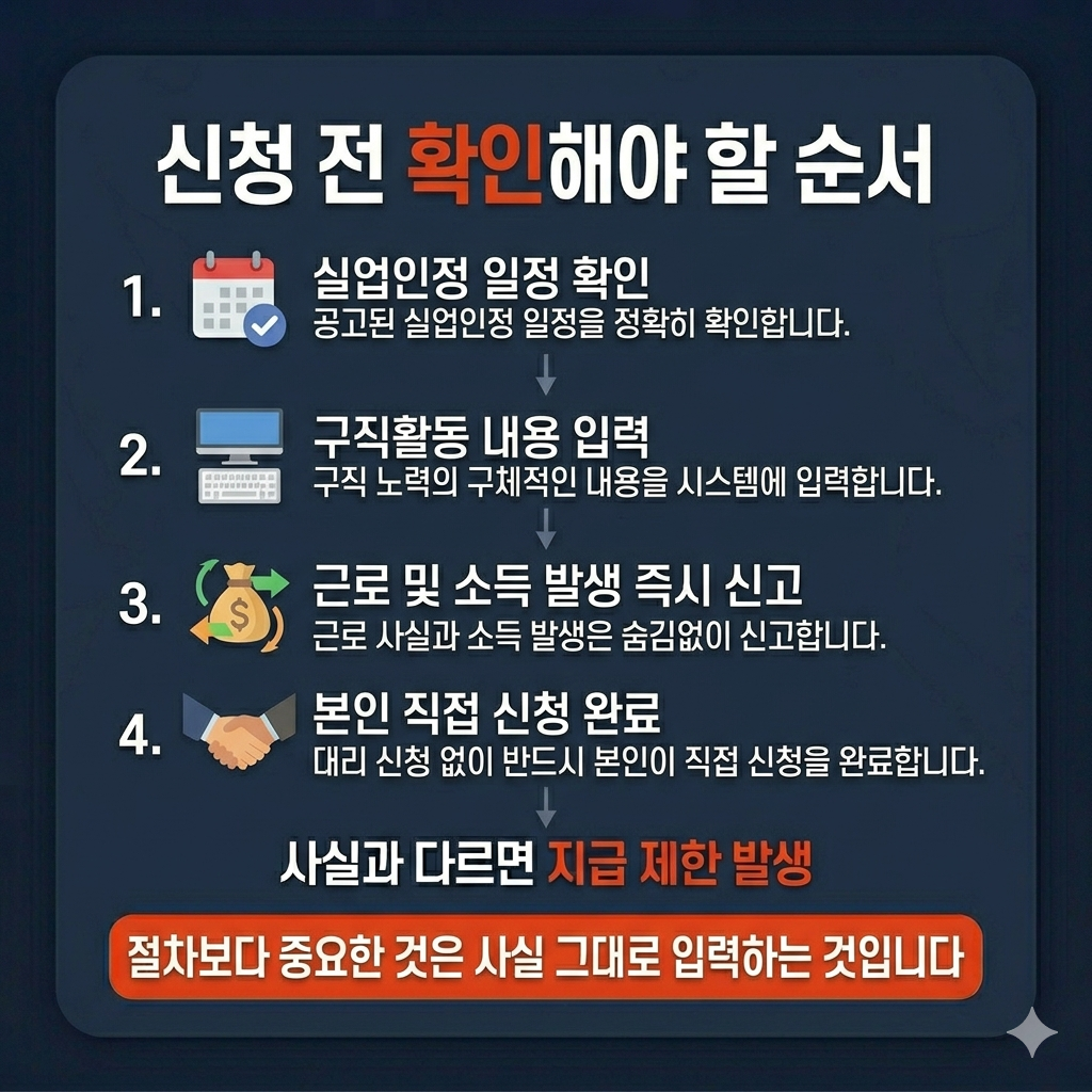 구직활동, 근로 여부, 소득 발생을 정확히 신고하지 않으면 대부분 제한 대상이 됩니다 ⚠️