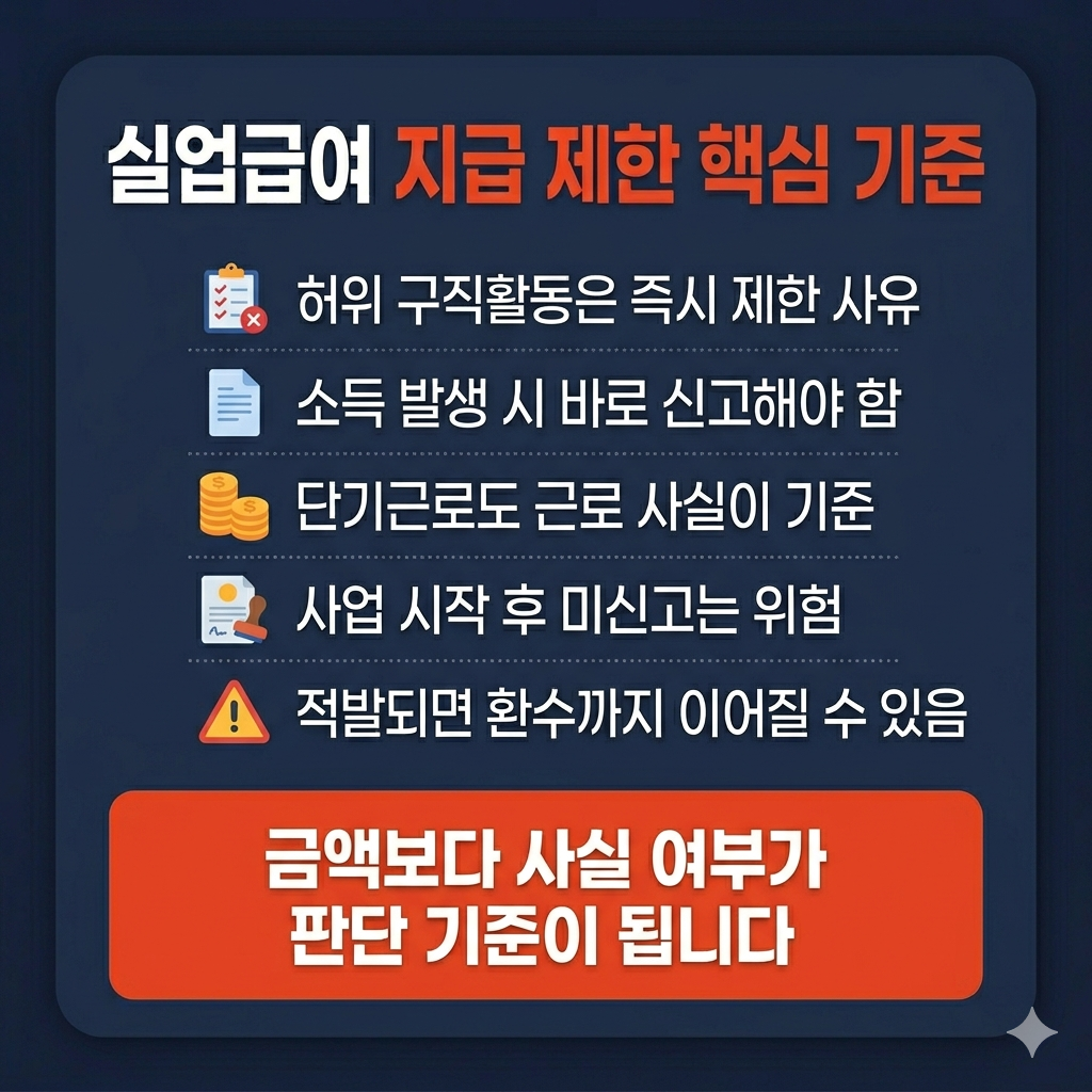 - 허위 구직활동과 소득 미신고가 대표적인 지급 제한 사유입니다 🚫