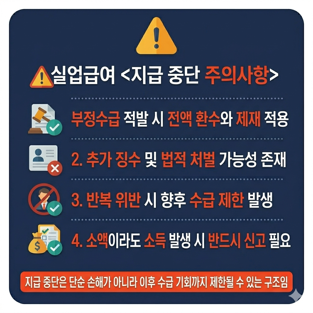 - ① 실업 상태 유지 위반 → 취업 시 즉시 종료 💼