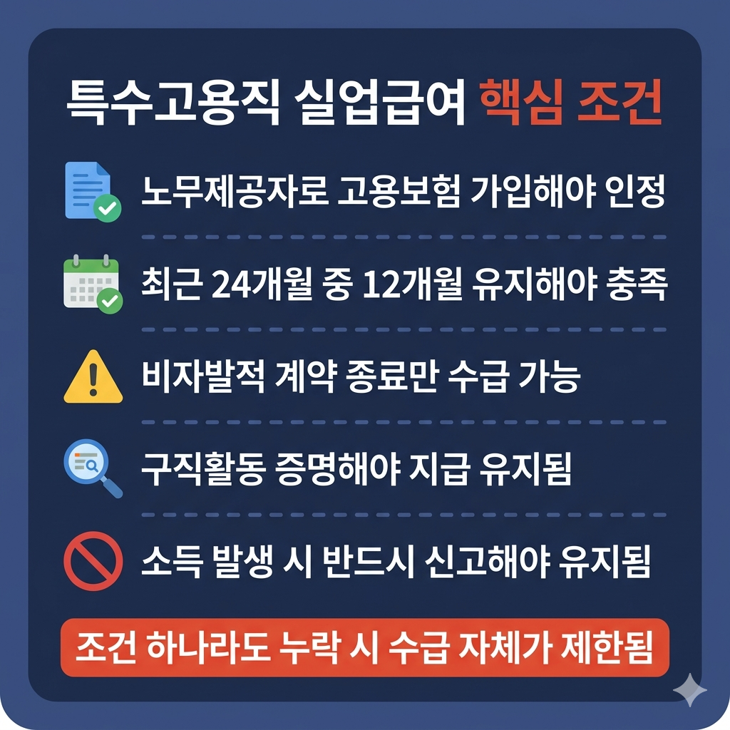 A 실업급여 특수고용직 기준상 구직활동은 필수이며, 미이행 시 지급이 중단됩니다.