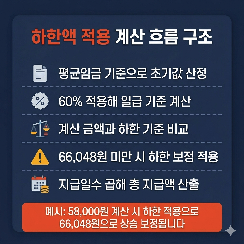 예를 들어 평균임금 기준 계산 결과가 하루 58,000원이라면, 실제 지급은 하한액인 66,048원으로 올라갑니다.