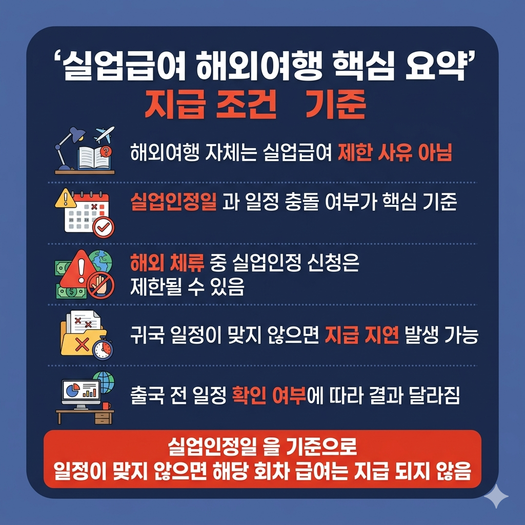 특히 실업인정일과 해외 체류 일정이 겹치면 해당 회차 급여가 늦어지거나 제한될 수 있어, 출국 전 기준부터 정확히 확인해야 합니다.