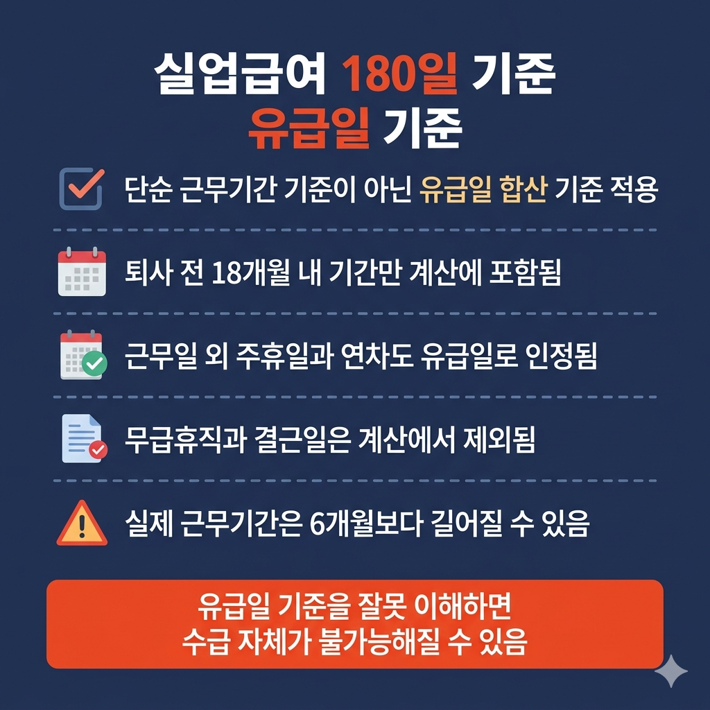 핵심은 단순 근무기간이 아니라 ‘유급일 기준 180일’입니다. 이 기준을 정확히 이해해야 실업급여 손해를 피할 수 있습니다.