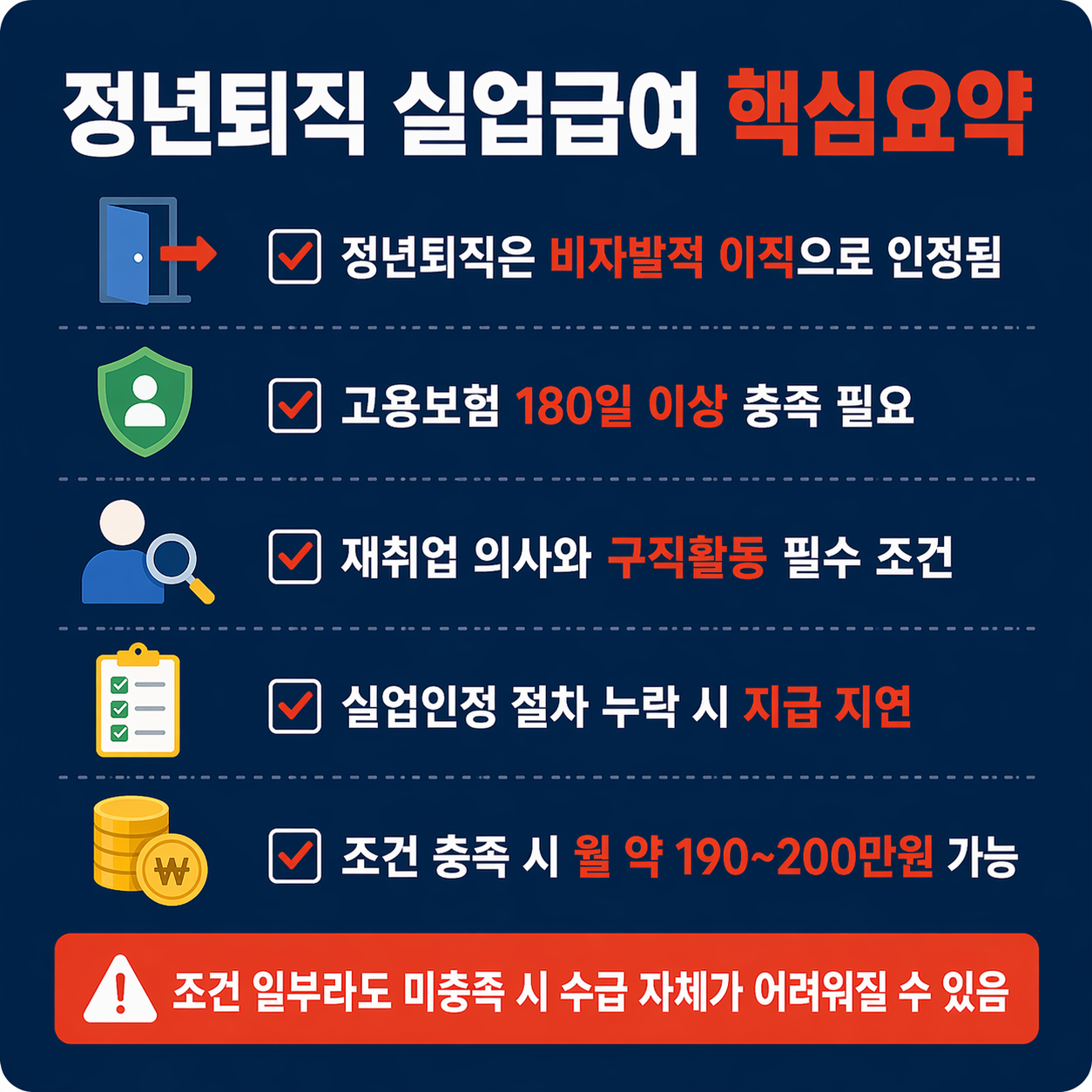 - 정년퇴직 실업급여는 고용보험 가입기간 등 기본 요건 충족이 필요합니다 📊