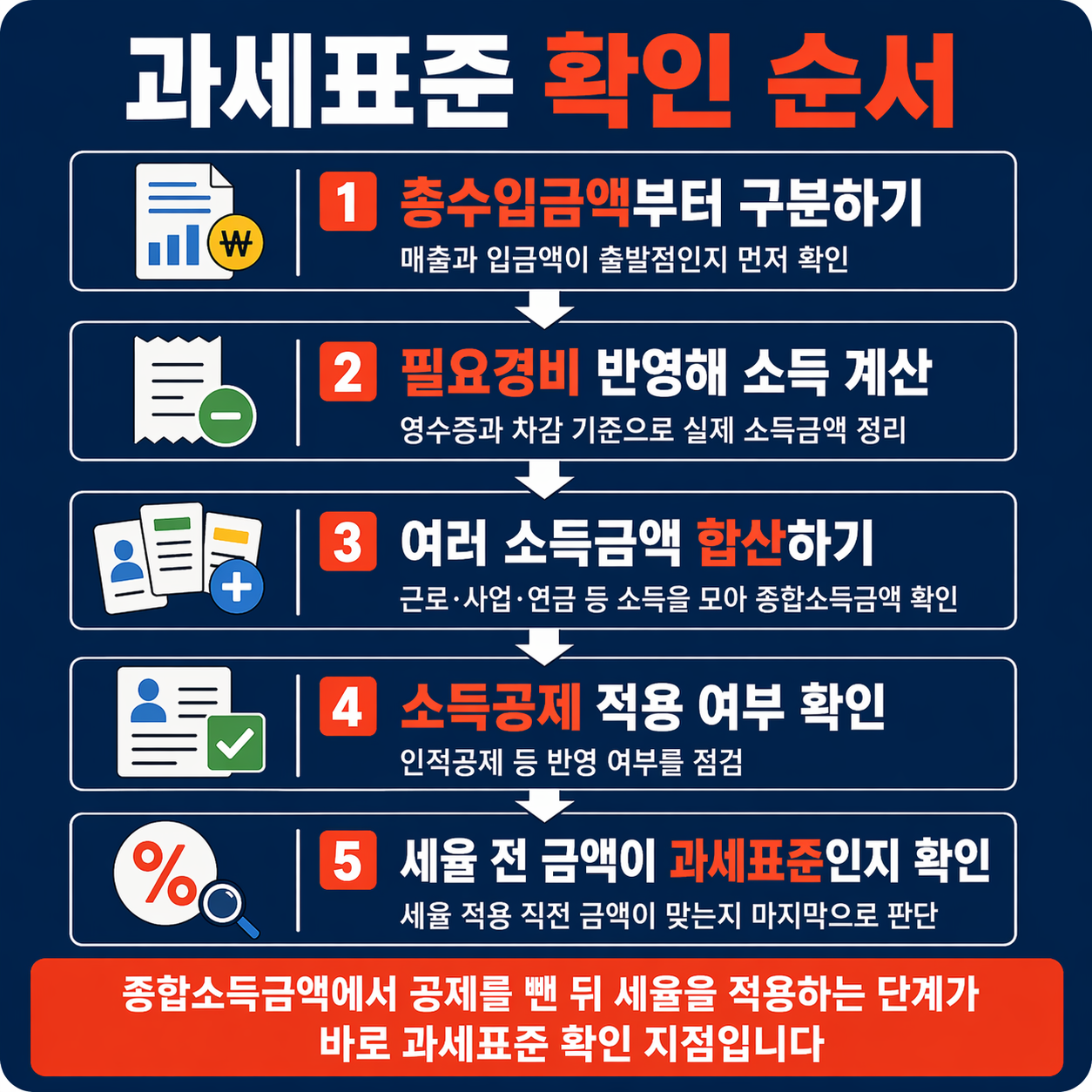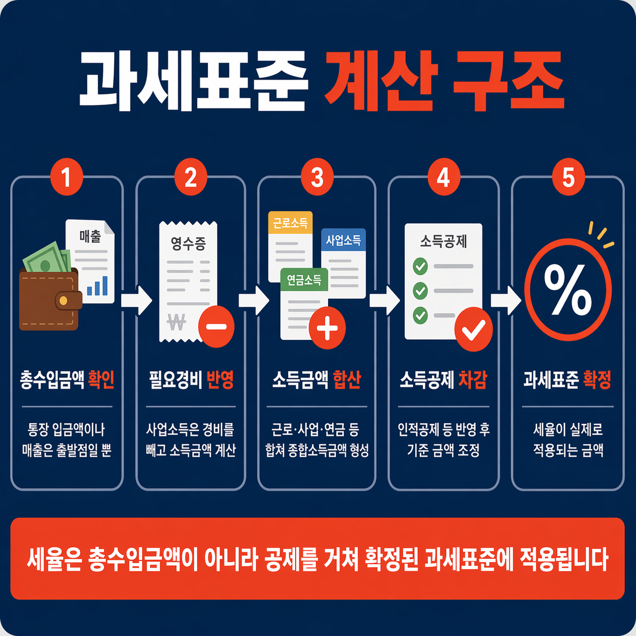 - 📌 종합소득세 과세표준은 총수입금액이 아니라 공제 전후 계산을 거친 뒤 정해집니다.