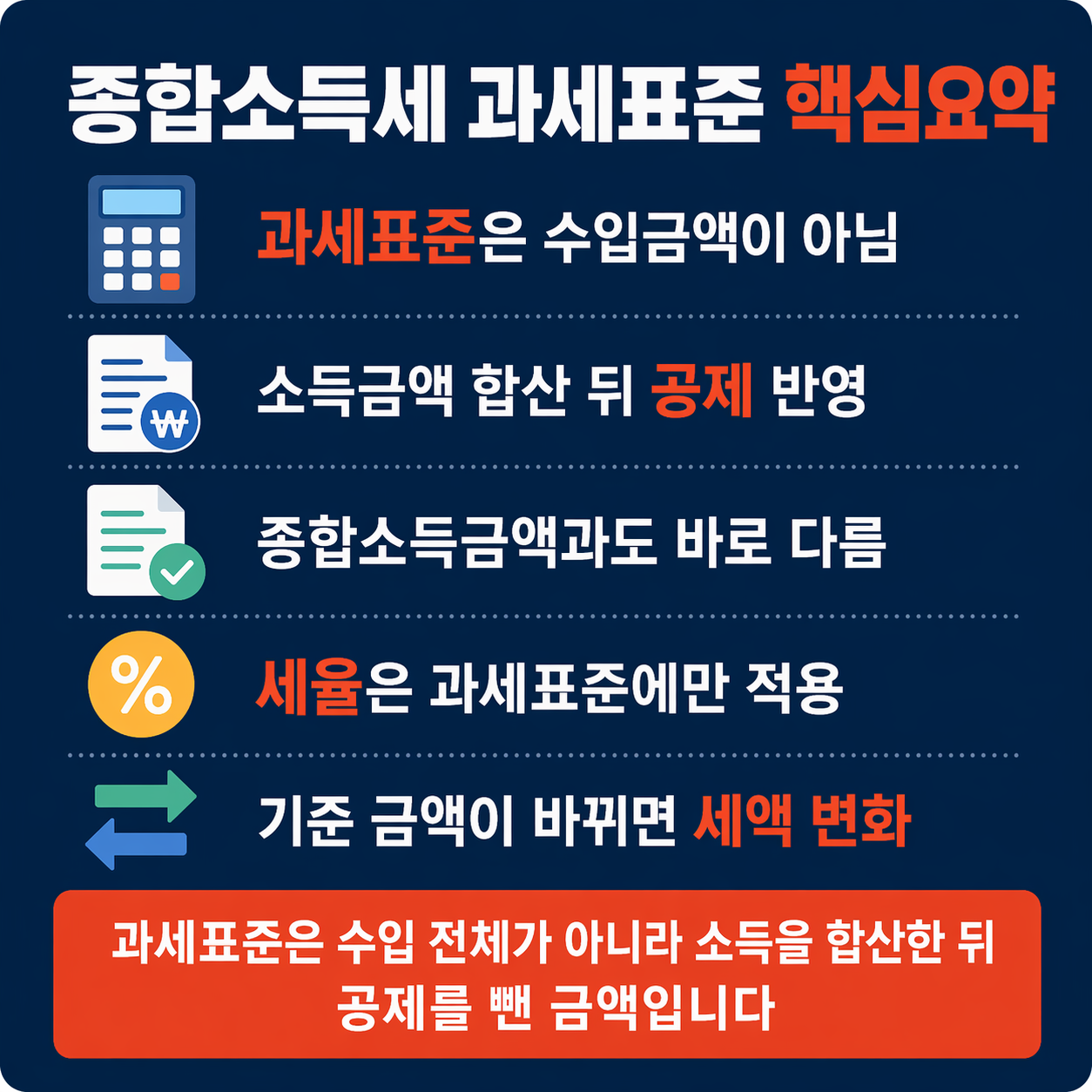 즉 종합소득세 과세표준은 수입이 아니라, 합산된 소득에서 공제를 뺀 뒤 남는 금액입니다.