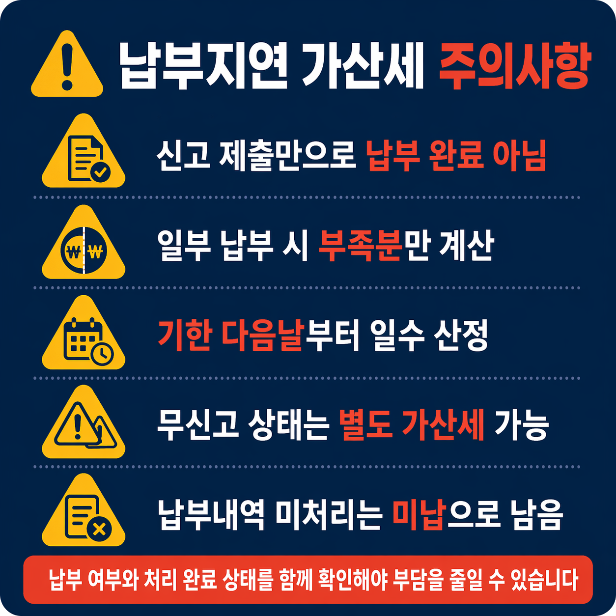 - 납부가 늦어질수록 가산세가 누적되므로 미납세액을 먼저 줄여야 합니다.