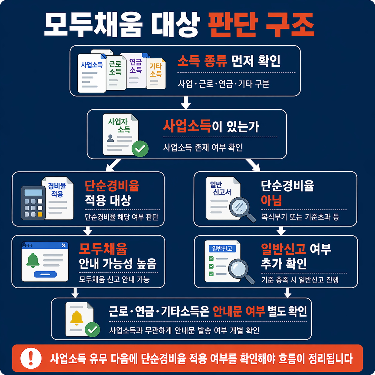 즉 사업소득이 있고 단순경비율 적용 대상이면 모두채움 안내를 받을 가능성이 높습니다.