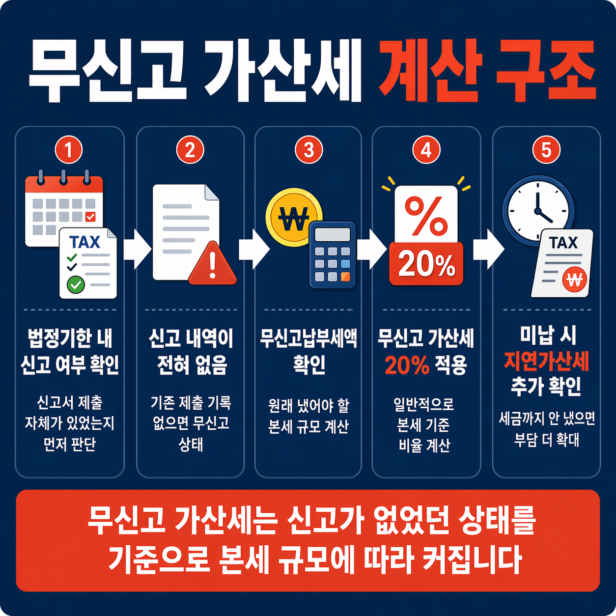 - 무신고 가산세는 일반적으로 무신고납부세액 × 20% 구조로 계산됩니다.