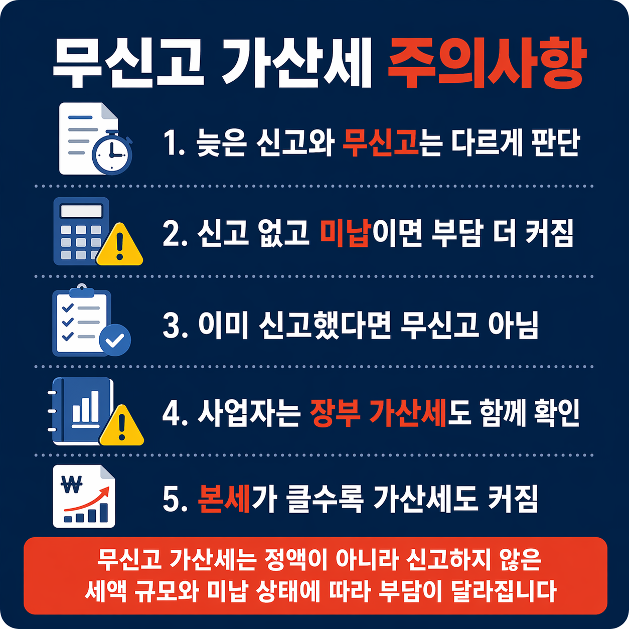 - 📌 법정신고기한까지 과세표준과 세액을 신고하지 않으면 무신고 가산세 대상이 됩니다.
