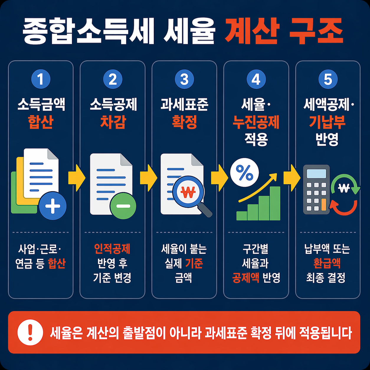- ✔ 계산 흐름은 소득금액 합산 → 소득공제 → 과세표준 → 세율 적용 → 세액공제·기납부세액 반영 순서입니다.