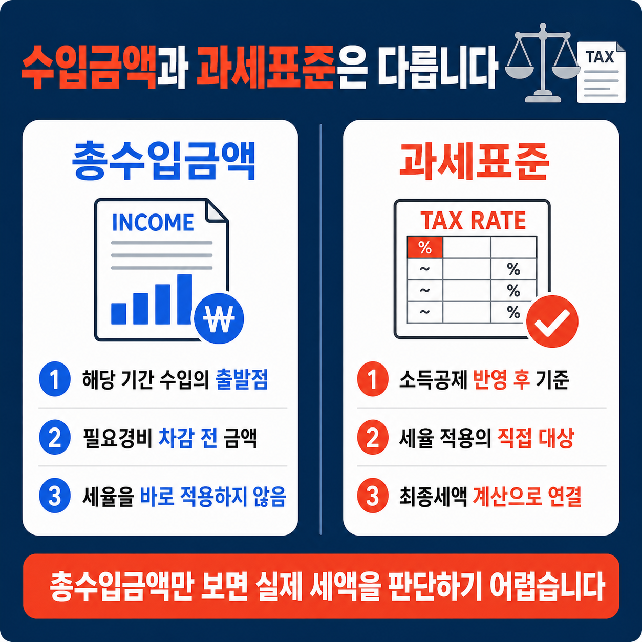 - 총수입금액과 소득금액을 같은 금액으로 보면 과세표준 판단이 달라질 수 있습니다.