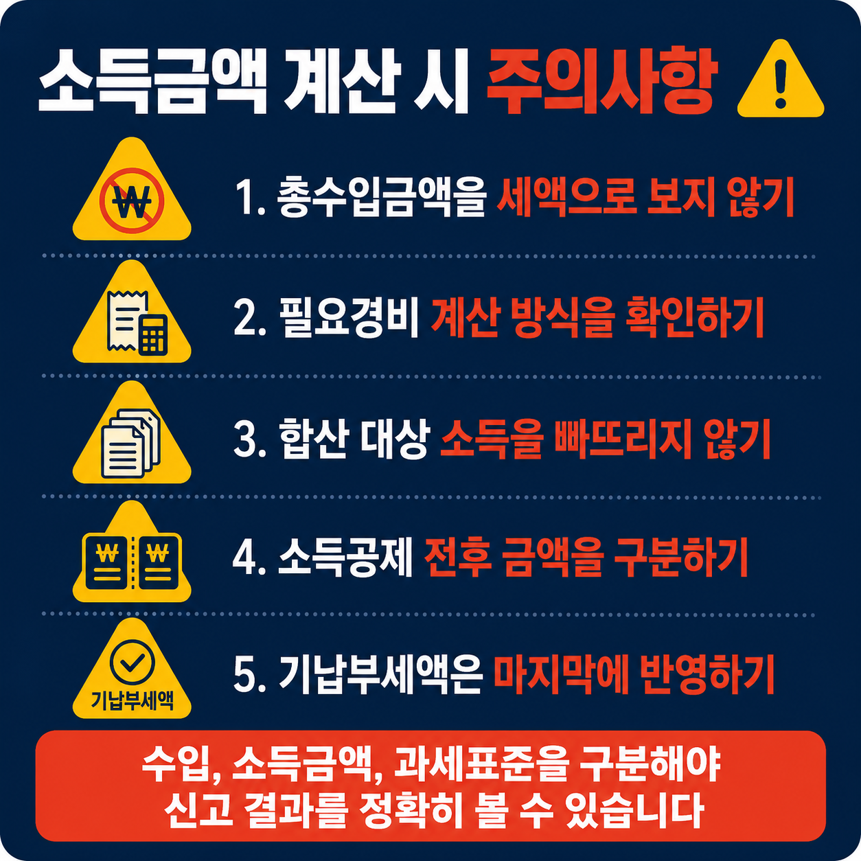 - 사업소득은 필요경비 계산 방식이 맞지 않으면 소득금액이 과다 또는 과소 계산될 수 있습니다.
