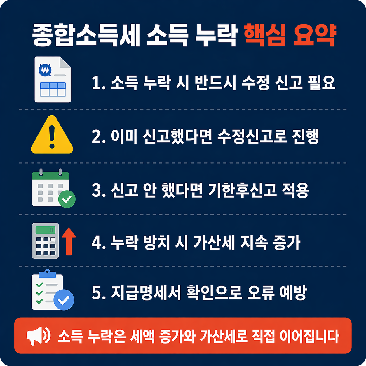 - 소득 누락은 반드시 수정해야 하며 방치하면 가산세 부담이 커질 수 있습니다.