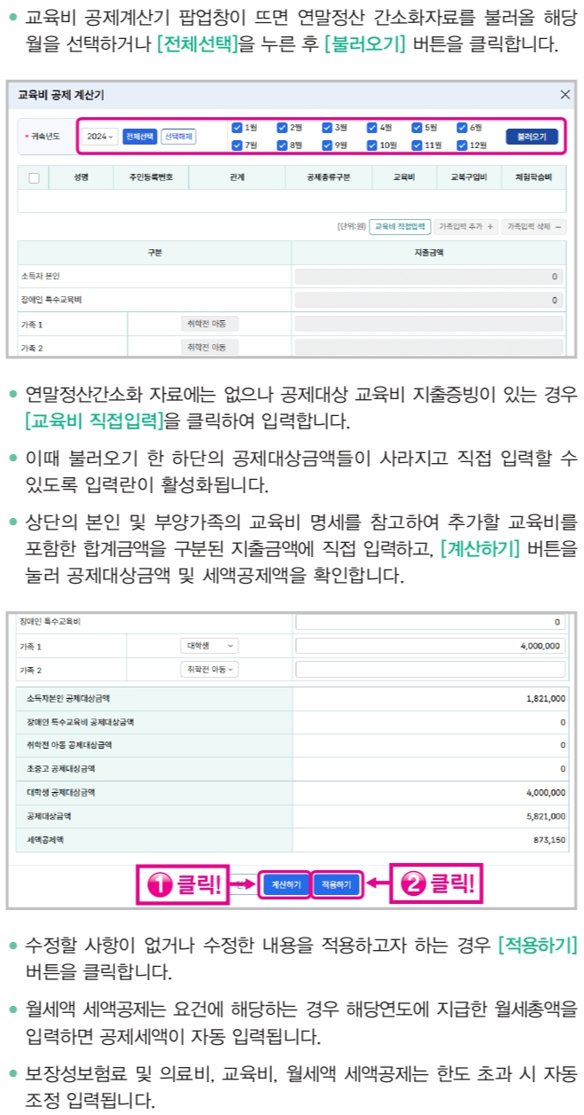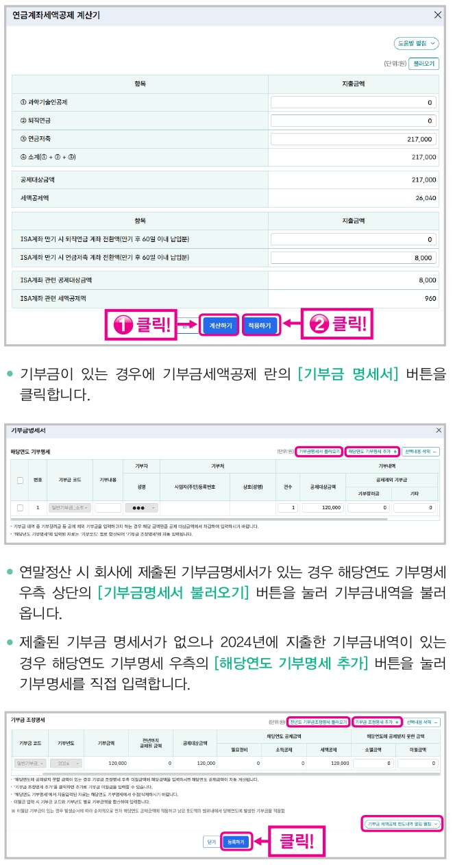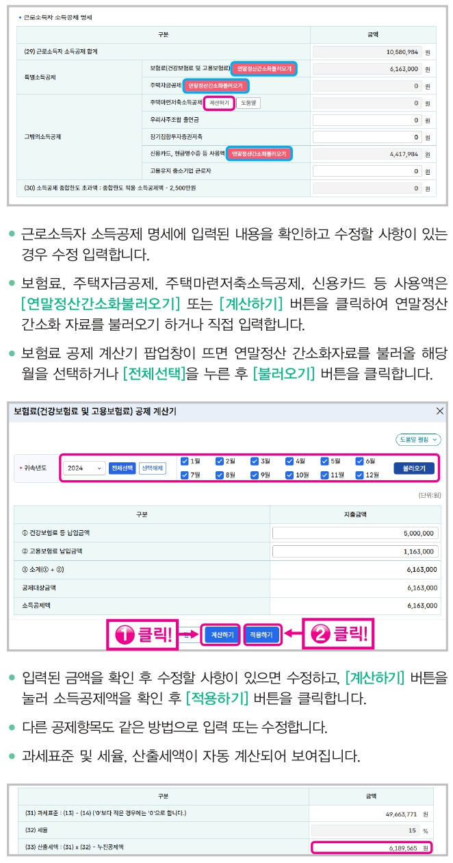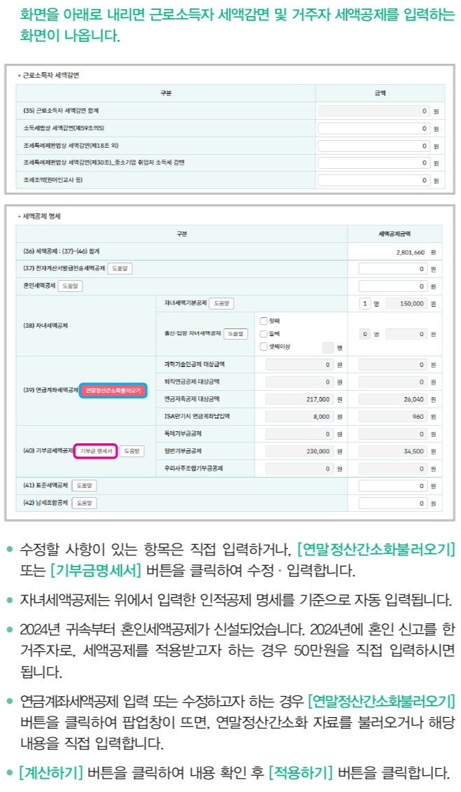 - 공제자료를 불러온 뒤 누락 항목이 있으면 환급액이나 납부세액이 달라질 수 있습니다.