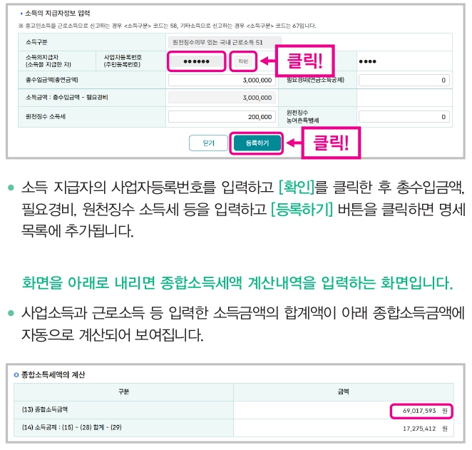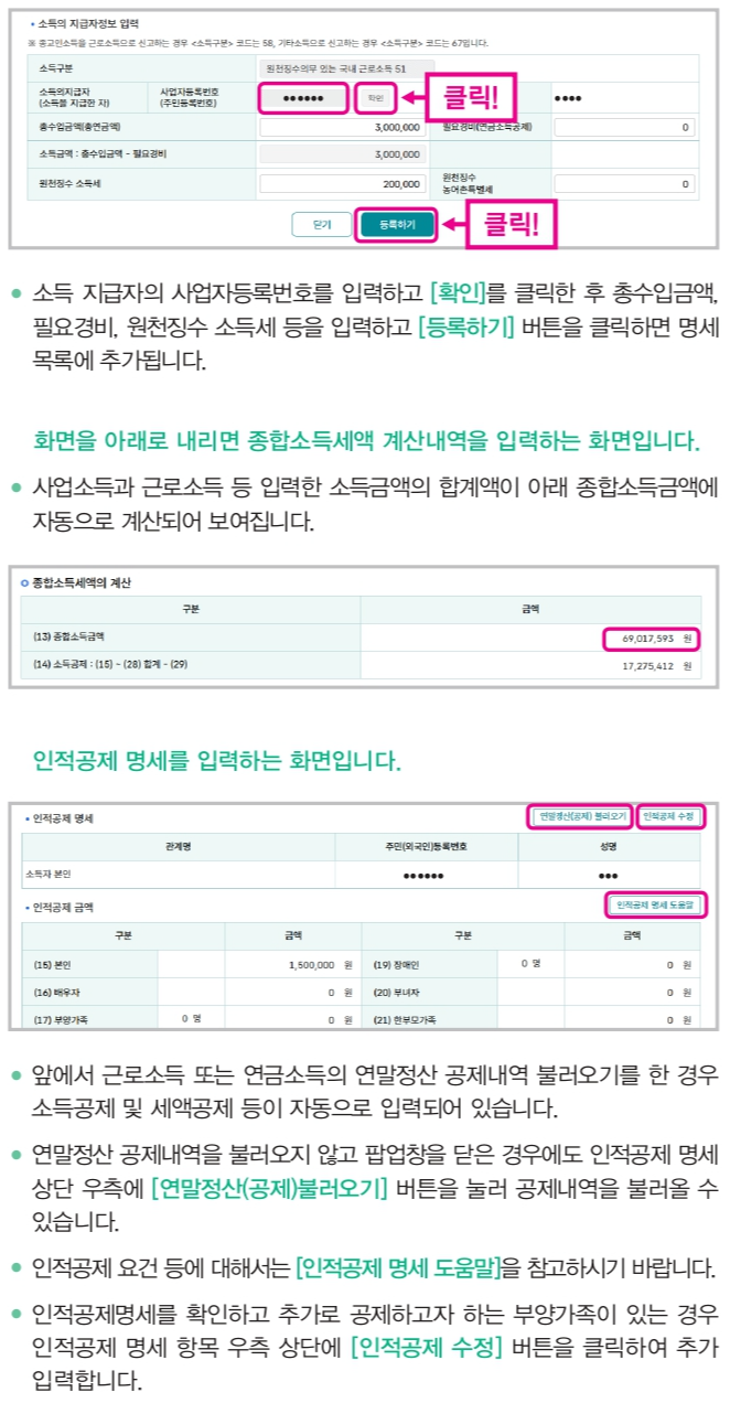 - 같은 소득을 중복 입력하면 세액이 과다 계산될 수 있습니다.