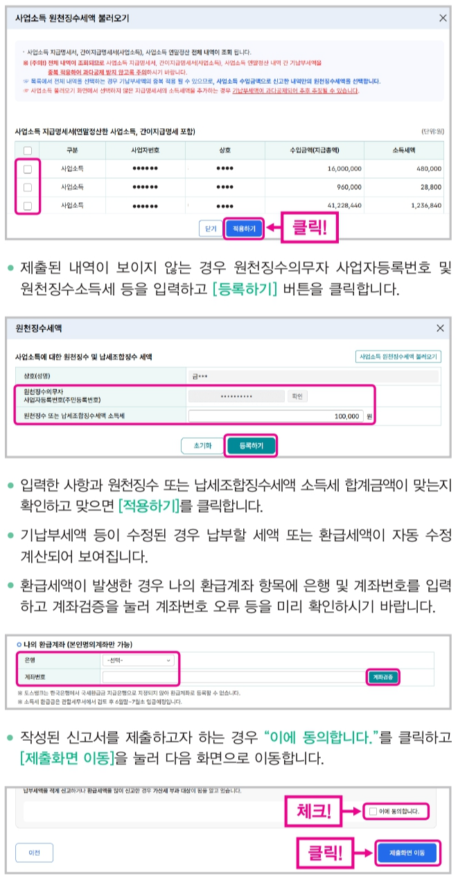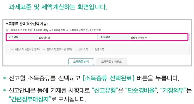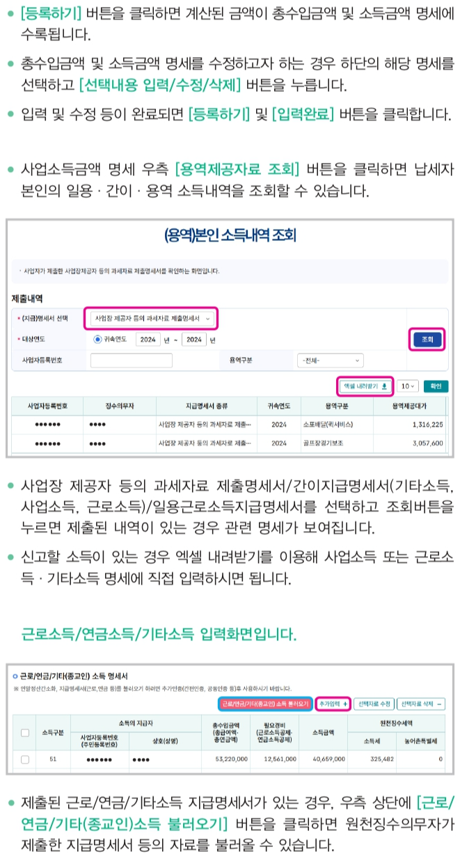 - ✔ 소득자료는 지급명세서 불러오기로 자동 입력할 수 있지만 선택 누락 시 신고 금액이 달라집니다.