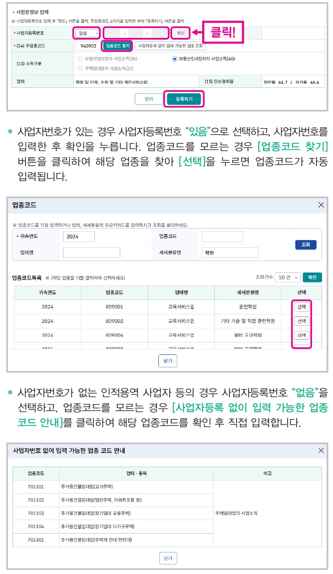 - 사업소득 추가 입력 위치를 찾지 못해 필요한 항목이 비어 있음