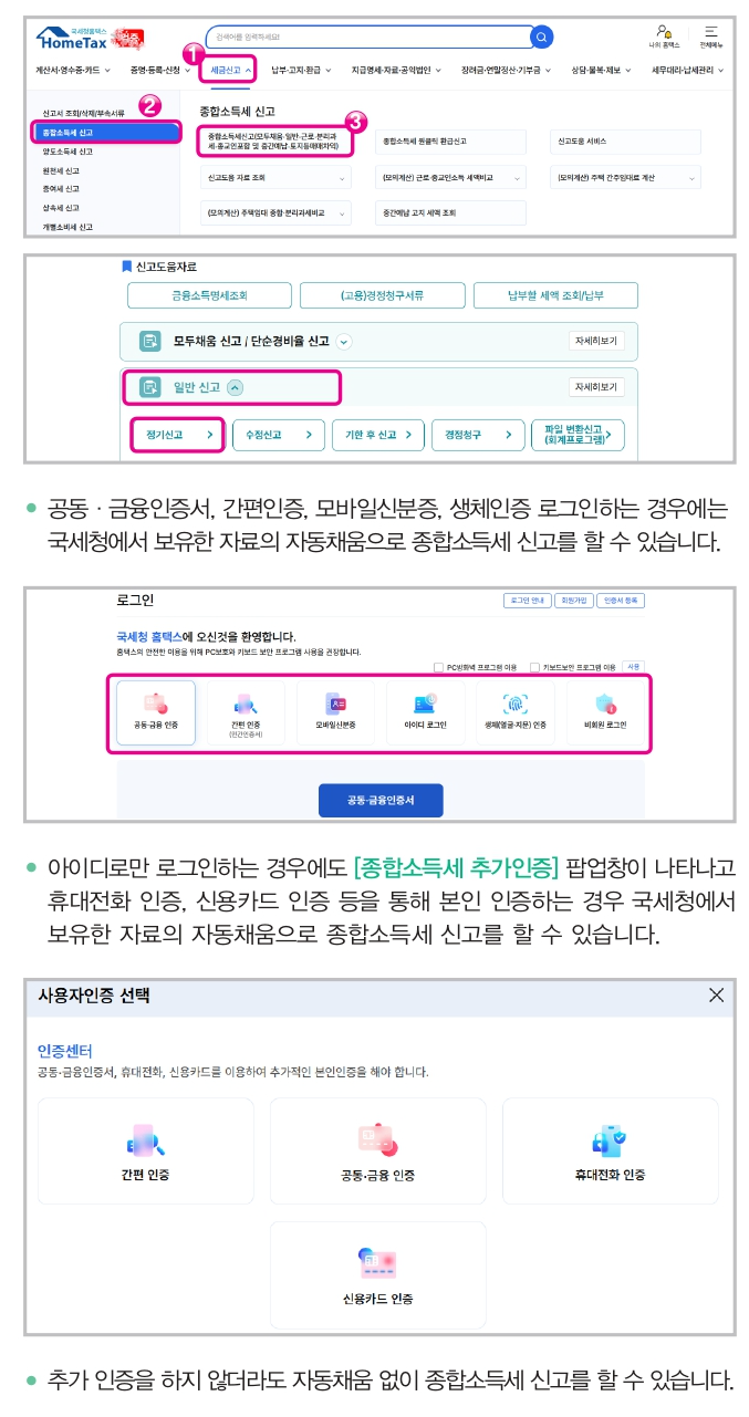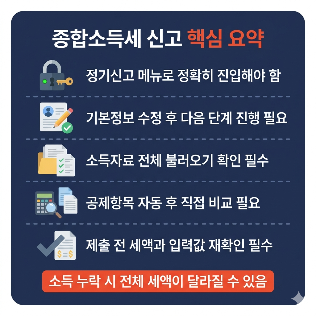 - 📌 홈택스 로그인 후 종합소득세 정기신고 메뉴로 들어가면 신고를 시작할 수 있습니다.