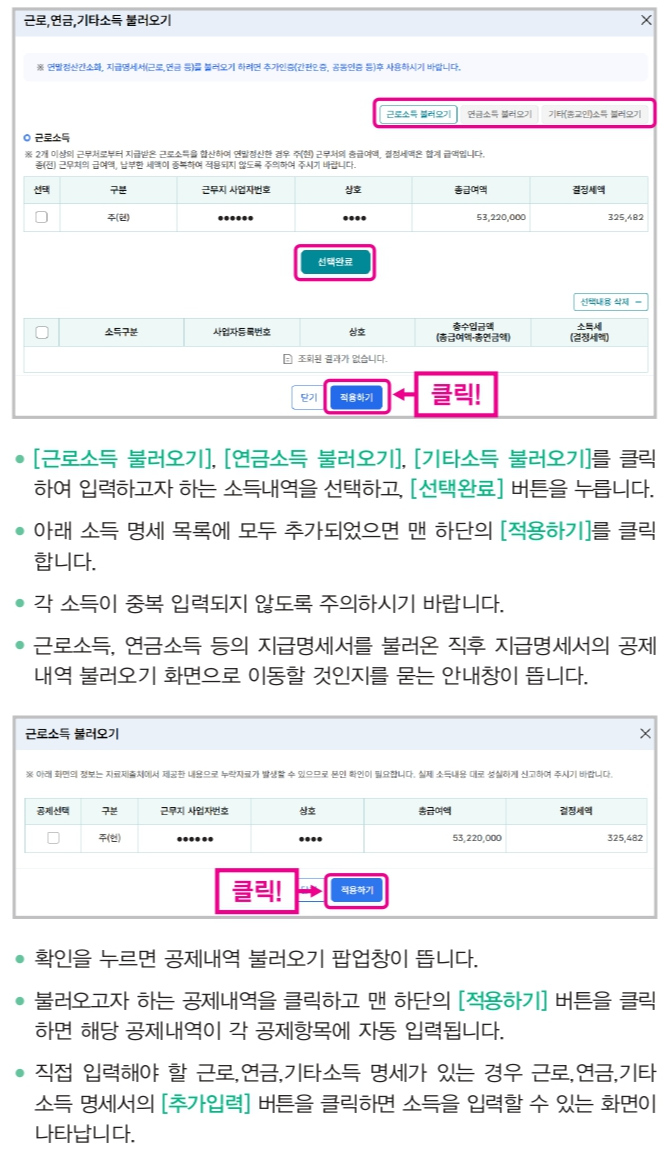 - 소득 불러오기 후 일부 지급명세서만 체크해 전체 소득이 반영되지 않음