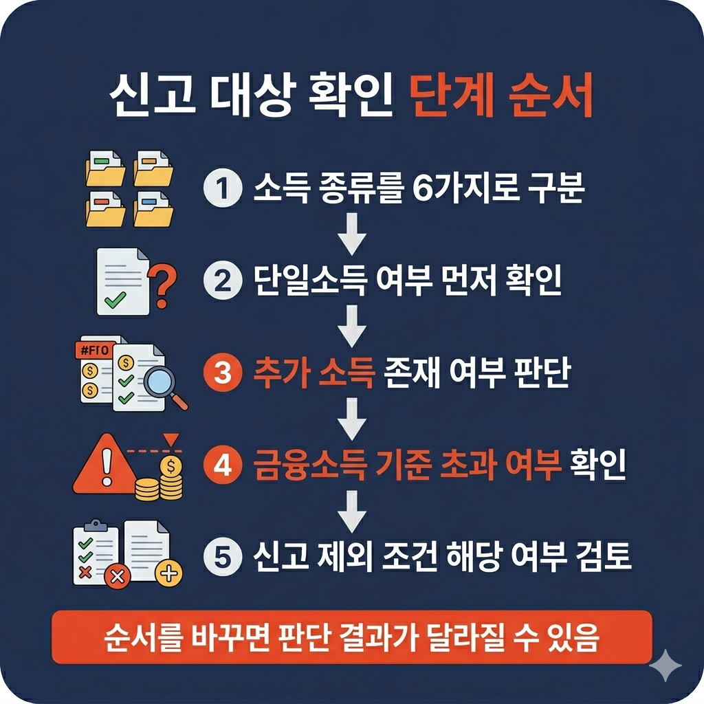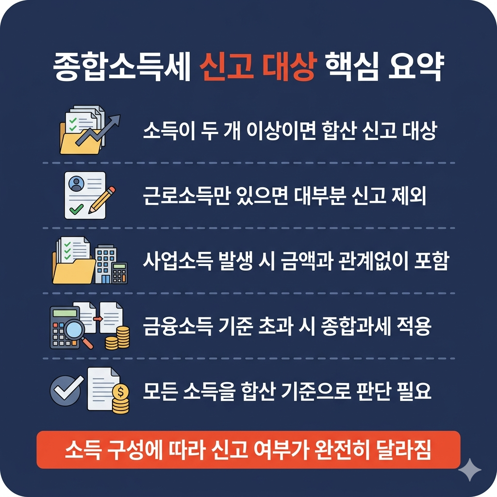 - 📌 이자·배당·사업·근로·연금·기타소득이 2개 이상이면 신고 대상이 될 수 있습니다.