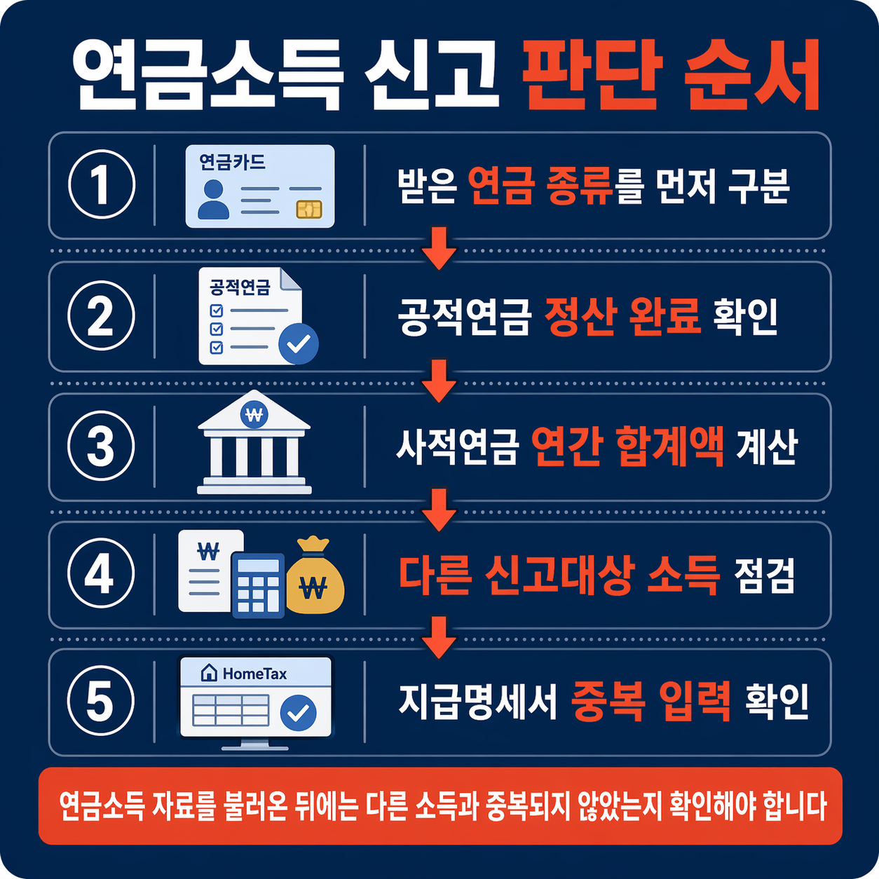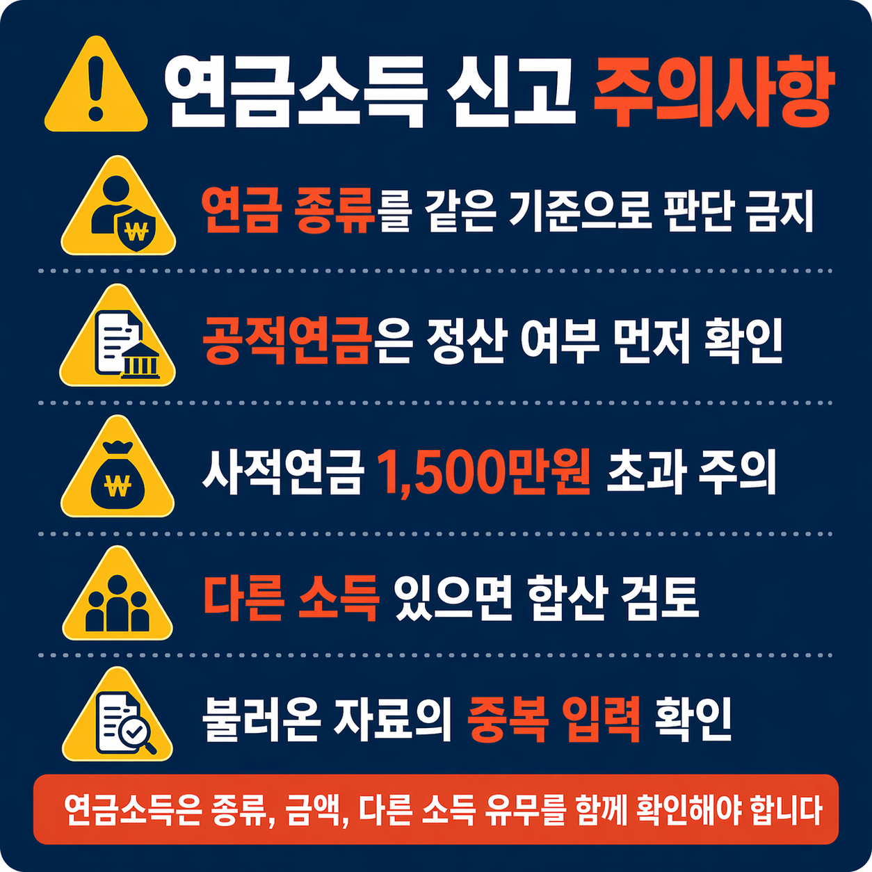 - 연금소득 외에 사업소득, 근로소득, 기타소득이 있으면 함께 신고 여부를 확인해야 합니다.